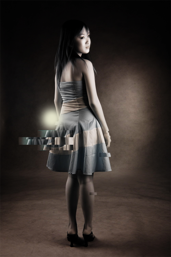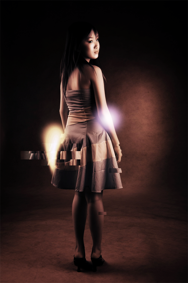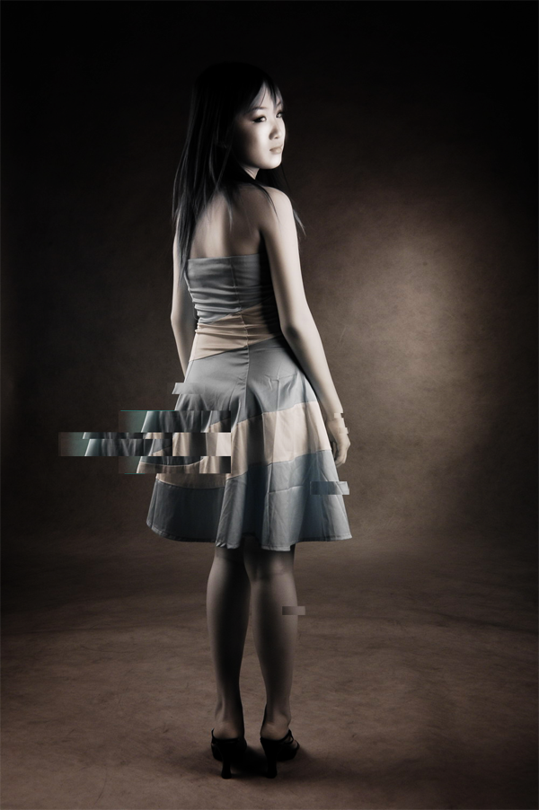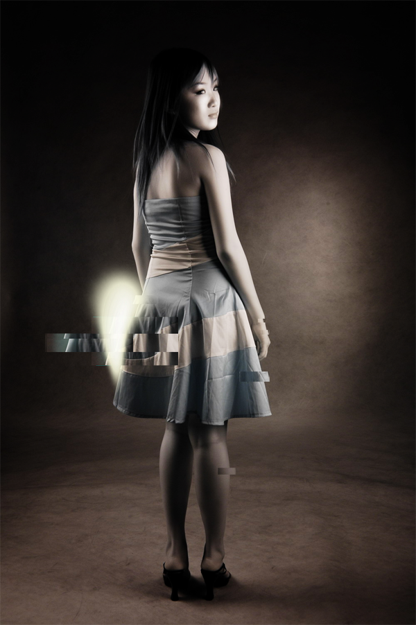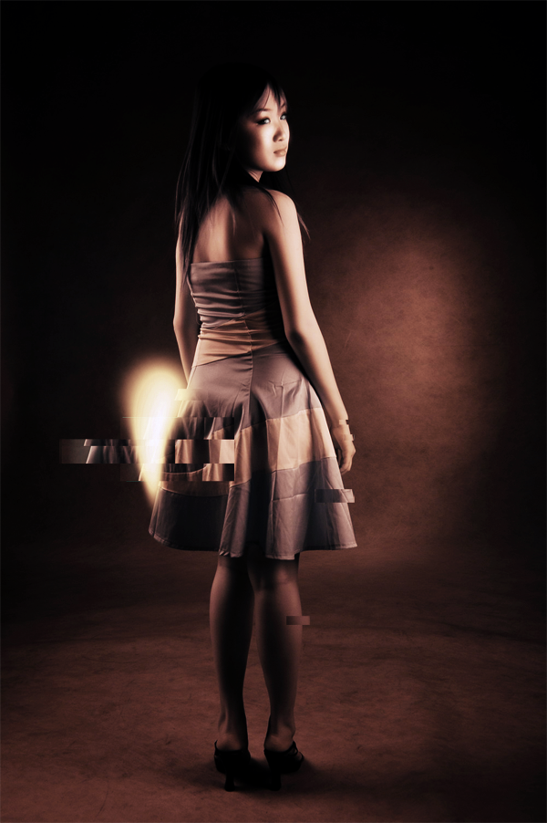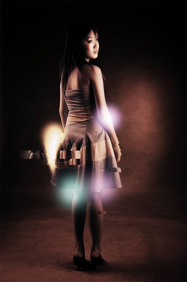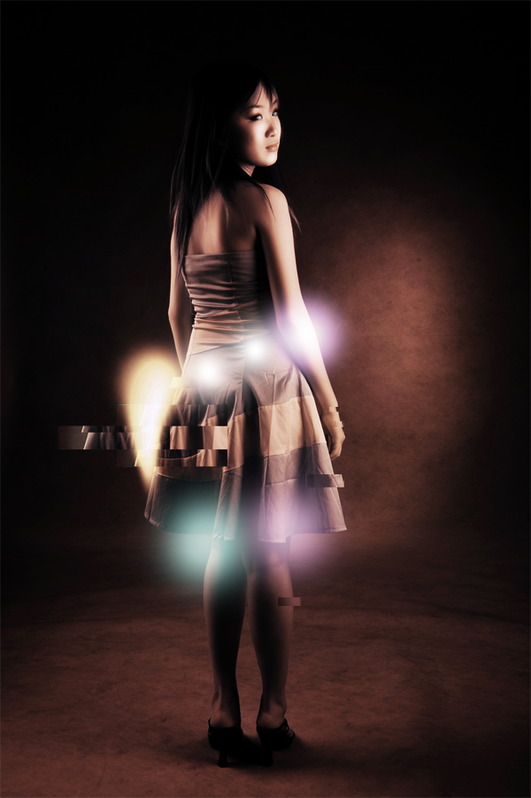 1. Atsidarome nuotrauką ir paimkime Rectangular Marquee Tool. Pasižymime stačiakampio formą ant suknelės ir paspaudžiame klavišų kombinaciją CTRL + J. Matome Mūsų pažymėta dalis pasiduplikavo. Tempkime ją į kokią norime pusę taip, kad nesutaptų su pradinių atvaizdu. Šį pirmą žingsnį pakartokime kelis kartus įvairiose vietose.