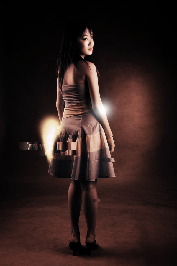 1. Atsidarome nuotrauką ir paimkime Rectangular Marquee Tool. Pasižymime stačiakampio formą ant suknelės ir paspaudžiame klavišų kombinaciją CTRL + J. Matome Mūsų pažymėta dalis pasiduplikavo. Tempkime ją į kokią norime pusę taip, kad nesutaptų su pradinių atvaizdu. Šį pirmą žingsnį pakartokime kelis kartus įvairiose vietose.