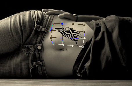 4. Su Move Tool įrankiu uždedame tatuiruotę ant kūno ir naudodami Edit - Transform - Scale ir Rotate, sumažiname ją iki norimo dydžio, bei pasukame norimu kampu.